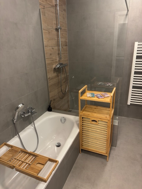 Il se compose d’une chambre spacieuse, d’un séjour lumineux avec cuisine ouverte, d’une salle de bain avec douche et baignoire, d’un WC séparé et d’une buanderie dans l’appartement.