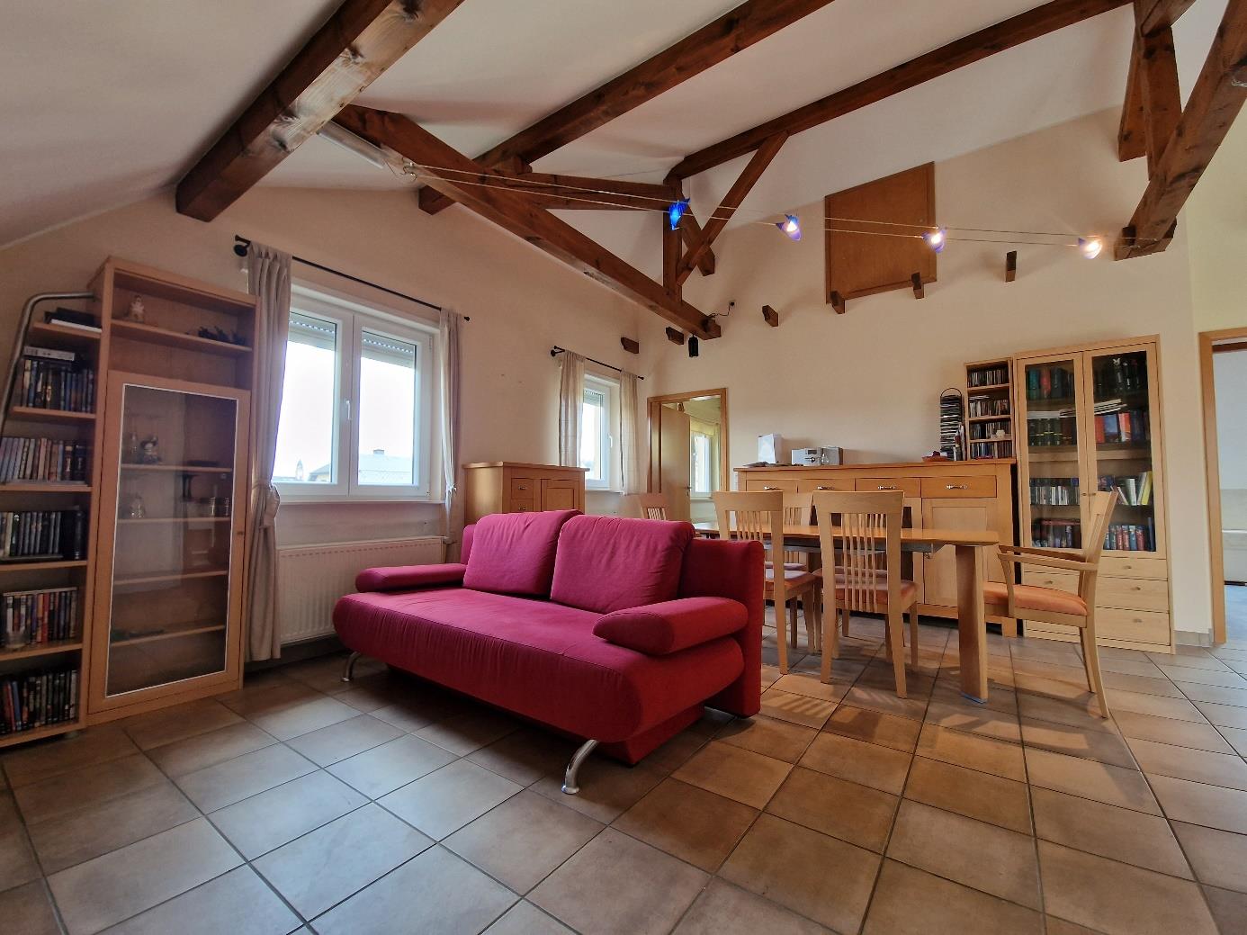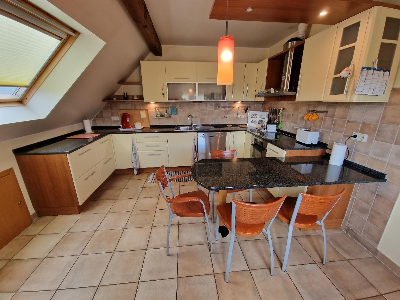 Palier, séjour / salle à manger avec accès à la terrasse, cuisine séparée entièrement équipée, salle de bain avec baignoire et douche, WC, raccordements pour lave-linge et sèche-linge, espace de rangement sous les combles.