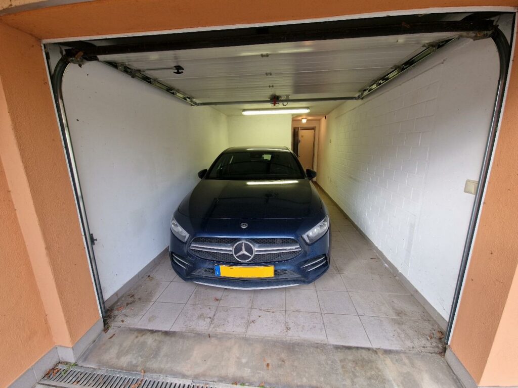 Cave privative intégrée dans le garage fermé, buanderie commune et emplacement de parking extérieur.